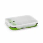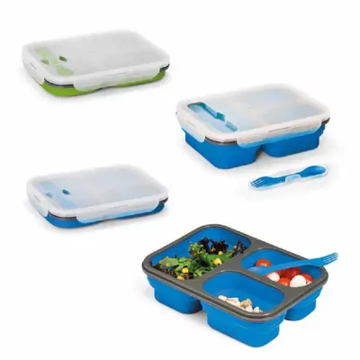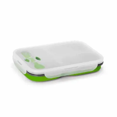 Marmita retrátil. Silicone e PP. Com 3 compartimentos e talher 2 em 1 (garfo e colher). Capacidade: 2 x 390 ml + 700 ml. Food grade. 241 x 176 x 68 mm | Dobrada: 241 x 176 x 40 mm.