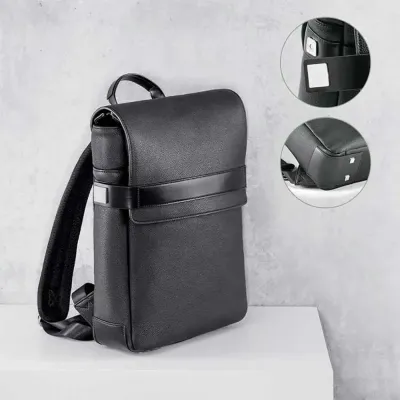 A mochila EMPIRE é sofisticada, construída em polipele texturada de elevada qualidade. O compartimento principal é composto por 2 divisórias almofadadas, compatíveis com notebook até 14'' e tablet até 10.5'', e diversos bolsos que facilitam a arrumação. Na parte frontal, existe mais um bolso grande. Os fechos laterais têm imã resistente e placas metálicas ideais para personalização. A parte posterior com sistema de apoio acolchoado para as costas e as alças totalmente almofadadas garantem máximo conforto e os cantos inferiores reforçados asseguram durabilidade. Contém bolsos interiores e fecho. A mochila EMPIRE tem banda para transporte em trolley, o que a torna num objeto versátil e prático tanto para o dia-a-dia como para viagens de negócios. Fornecida em sacola de non-woven. 290 x 370 x 90 mm | Sacola de non-woven: 530 x 500 x 80 mm.