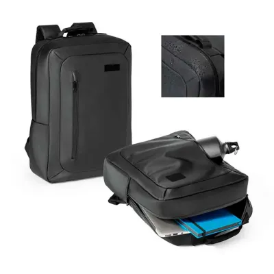Mochila para notebook. Poliéster 600D impermeável. Compartimento principal almofadado para notebook até 15.6''. Bolso frontal. Zípers impermeáveis. Bolso lateral em tela. Parte posterior almofadada, com sistema de apoio acolchoado para as costas e alças almofadadas. Placa metálica removível com imã, para fácil gravação. 280 x 400 x 110 mm.
