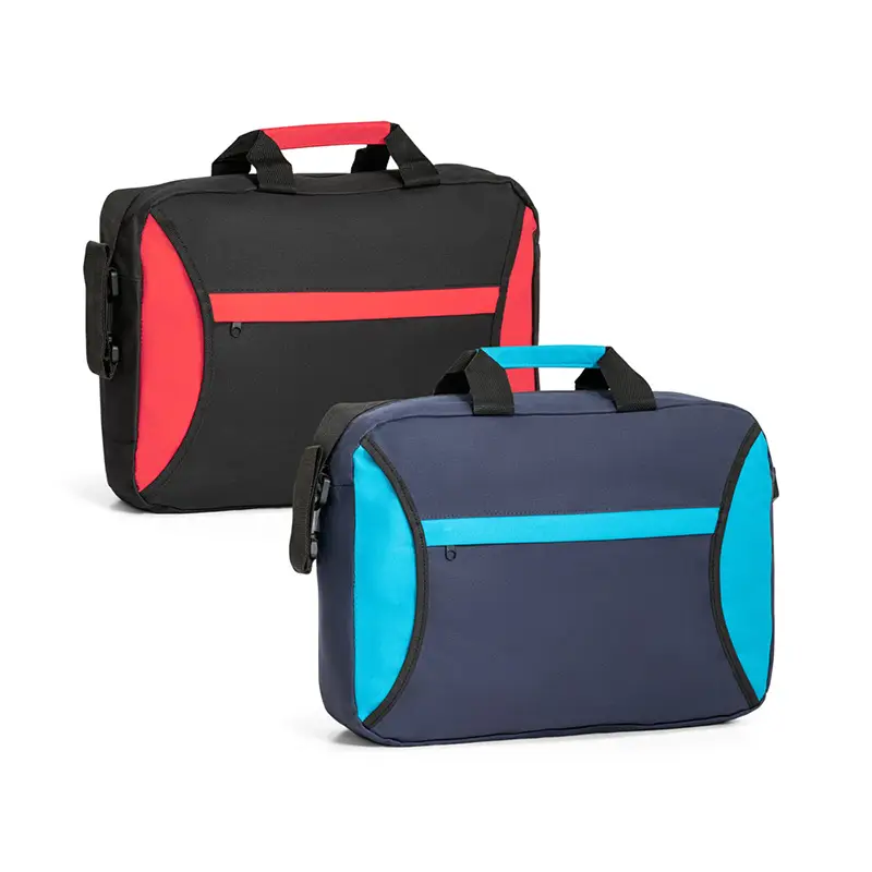 Pasta multifunções em 600D. Compartimento exterior aberto (forrado) com bolso frontal com zíper. A pasta tem alça de ombro ajustável e alças de mão com reforço