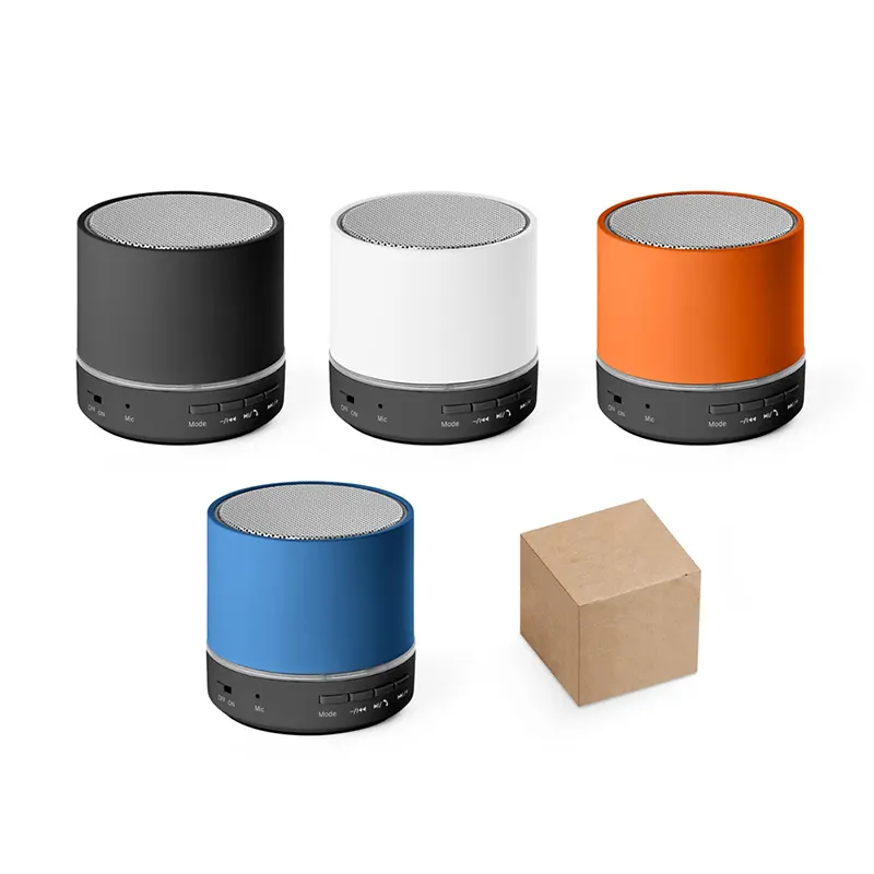 Caixa de som portátil com microfone, em ABS 100% reciclado com transmissão sem fios BT 5.3. Tem potência de 3W, bateria com 400 mAh e autonomia aproximada de 4h30. Permite ainda as funções de atender chamadas, leitor de cartões microSD, entrada AUX e reprodução automática via porta USB-A. Incluso cabo de carregamento USB-C. Fornecido em caixa presente de papel kraft reciclado que pode ser reutilizada como suporte de celular. A grelha é fornecida solta para pedidos não personalizados.