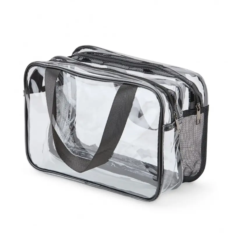 Nécessaire de PVC. Possui dois compartimentos e duas alças laterais de mão em nylon.