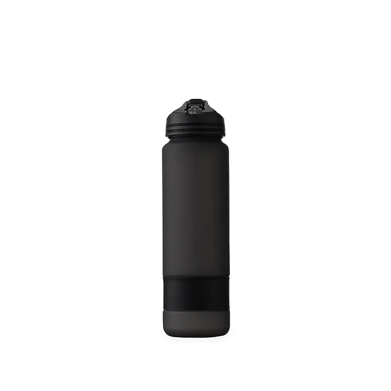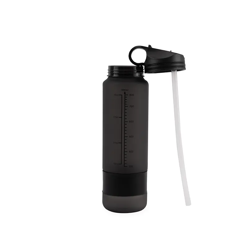 Squeeze plástico com acabamento fosco, marcação de volume e capacidade máxima de 900ml. Possui tampa rosqueável com alça fixa, bico flip e canudo interno removível. Acompanha tira emborrachada removível.