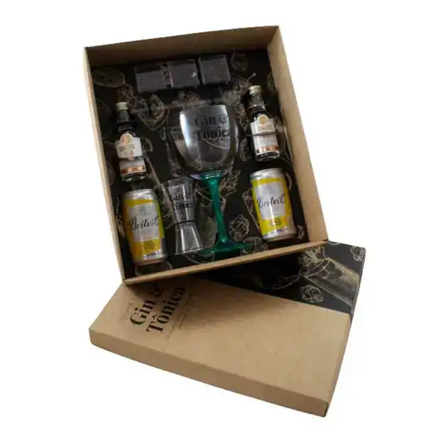 Kit em caixa de papel, 2 Gin Seagers 50ml, taça de acrílico para Gin, copo dosador de acrílico, 2 vodkas Britvic 220ml e 3 potes com especiarias.