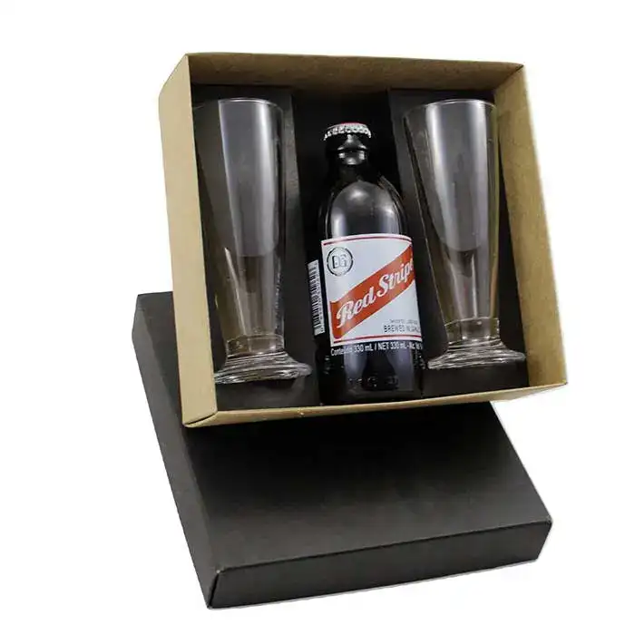 Kit Cerveja personalizado em caixa de papel, Cerveja Red Stripe 330ml e 2 Taças Tulipa. Gravação nas taças e tampa da caixa.