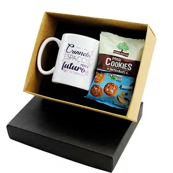 Kit chá em caixa de papel, caneca de porcelana 300 ml, sache de mini cookies Mãe Terra, gravação na caneca e na tampa da caixa.