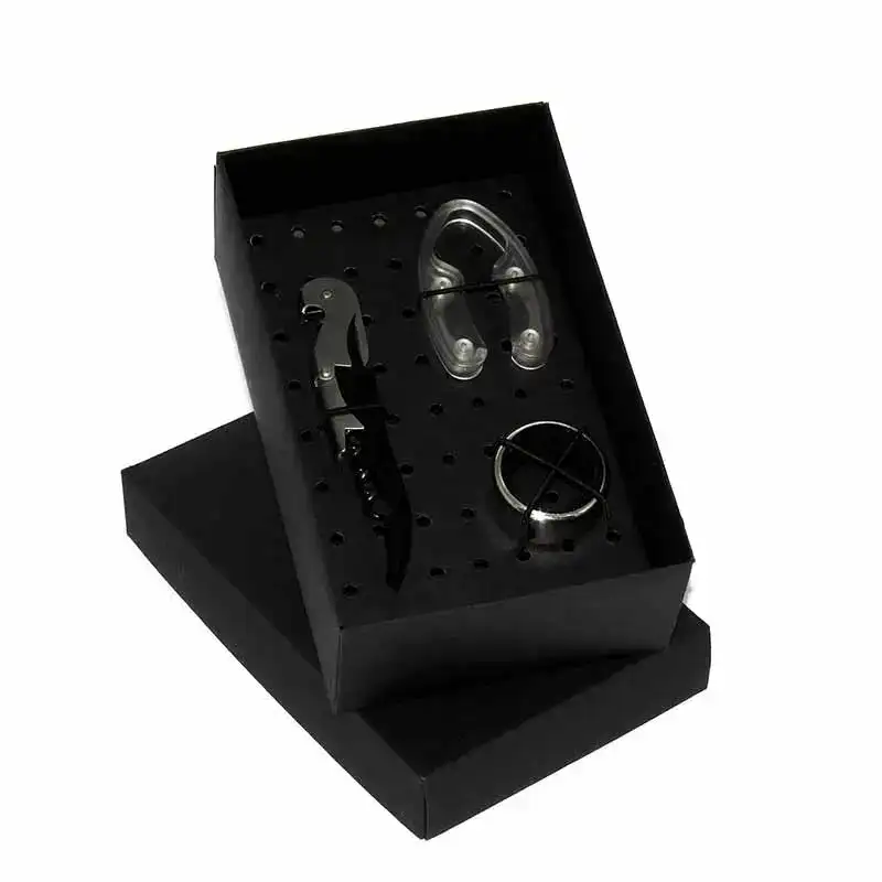Kit vinho em caixa de papel duplex com abridor de vinho, salva gotas e corta lacre com gravação na tampa da caixa.