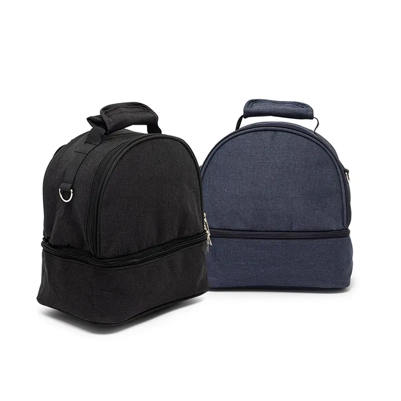 Bolsa térmica dupla em nylon com dois compartimentos térmicos isolados, capacidade de 7 litros. Contém bolso traseiro com zíper, alça de mão e alça para as costas.