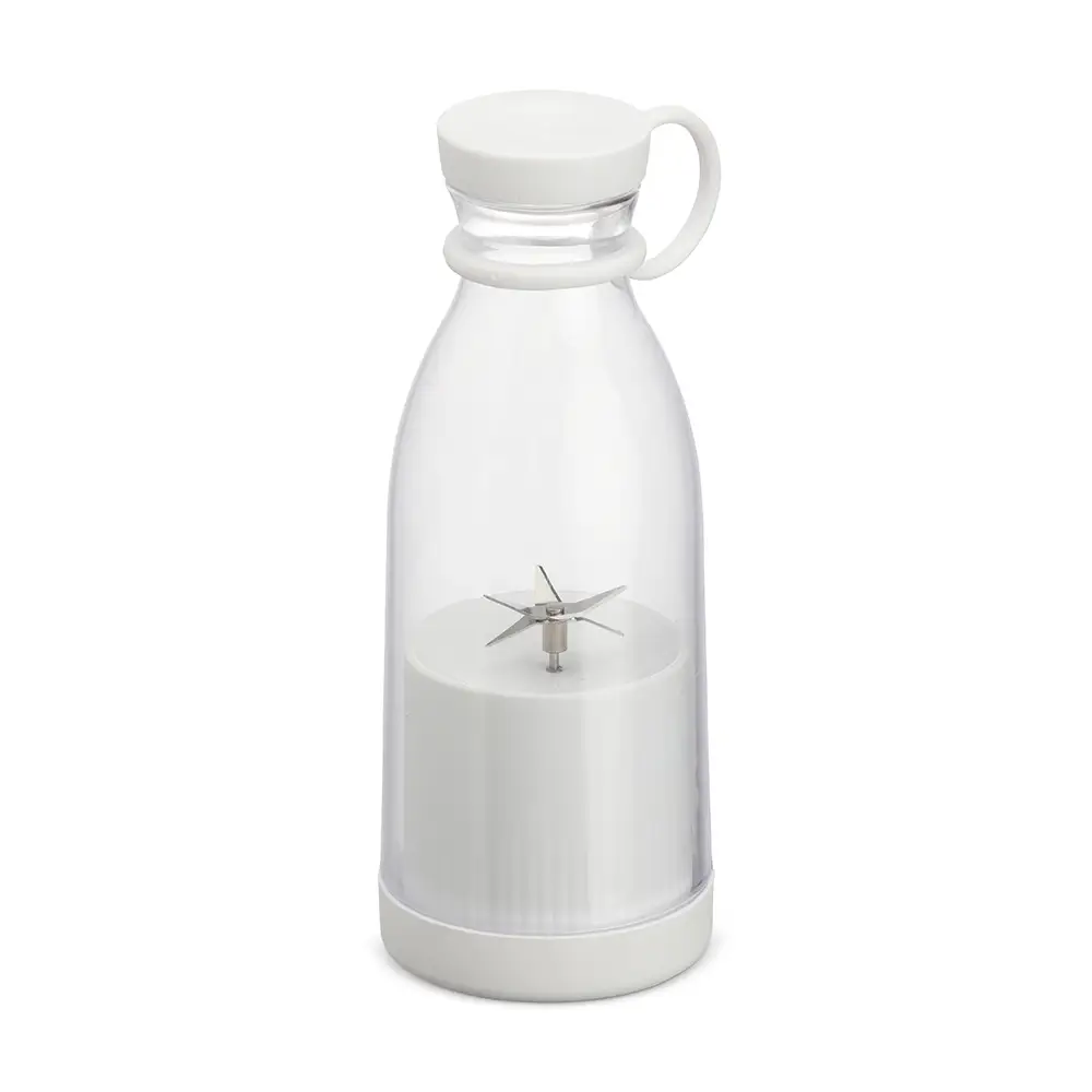 Mini liquidificador portátil personalizado com capacidade de 380ml. Contém tampa rosqueável plástica com alça emborrachada para transporte, ventoinha inox 6 lâminas e base plástica com borrachas antiderrapantes. Acompanha cabo USB