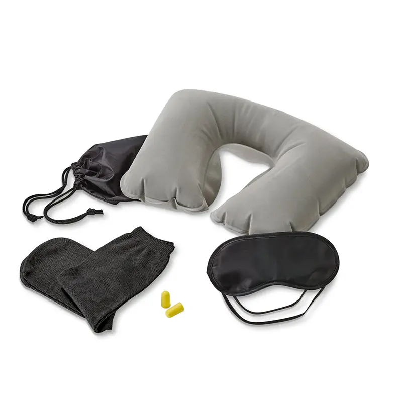Kit de viagem composto por almofada de pescoço, máscara para dormir, tampões para ouvidos (não é um equipamento de proteção individual) e 1 par de meias.