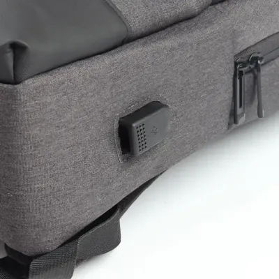 Bolso frontal com ziper. Bolso pequeno na lateral direita. Conector USB. Alça de mão. Alça de ombro acolchoada. Engate para mala de viagem.