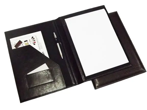 Pasta convenção em material sintético, tamanho A4, acabamento em pesponto, gravação em baixo relevo, espaço para bloco de anotações, folhas soltas, caneta e cartão