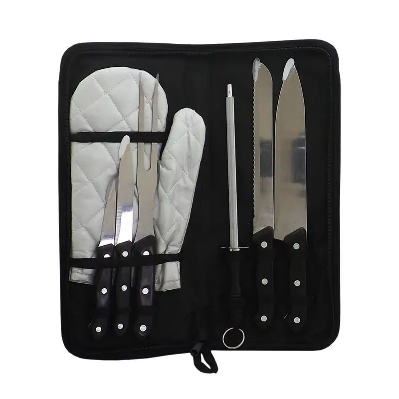 Kit churrasco 7 peças com estojo, contém: faca de legumes, faca para desossar, garfo, luva, chaira, faca de serra e faca peixeira. Estojo com alça para transporte e área interna com elástico de fixação para os utensílios.