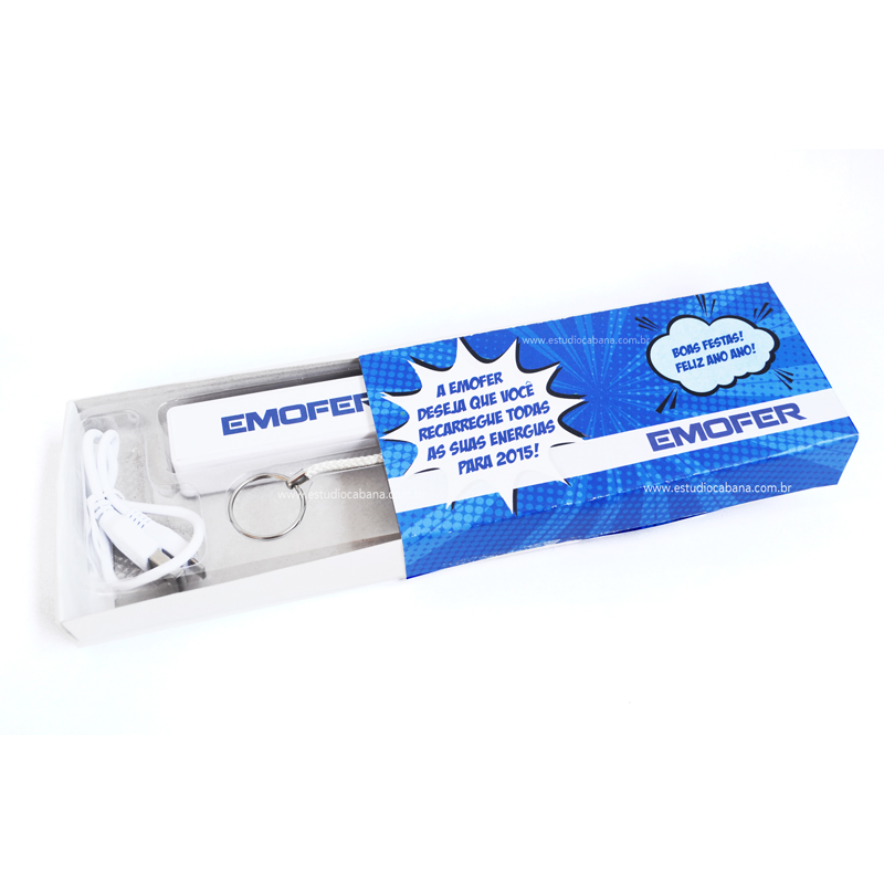 O kit acompanha a caixa deslizante personalizada, um carregador de celular portátil, um cabo usb e haste para chaveiro. Os smartphones trouxeram inúmeros recursos ao dia a dia dos usuários, mas também criaram uma dor de cabeça: a duração da bateria. Se antes os telefones chegavam a durar de 3 dias a uma semana longe da tomada, hoje poucos deles duram mais que 24 horas. O carregador portátil é a solução para este problema, pois trata-se de uma pequena bateria utilizada para carregar smartphones em absolutamente qualquer em que você esteja. Portanto, não tem quem não goste deste gift.