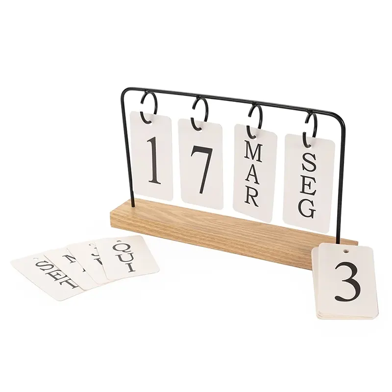 Um calendário permanente de mesa para dar um toque a mais elegante na decoração de mesas, estantes e outros espaços visíveis. Com base em madeira, suporte em metal e cartões em papel cartão, é um item durável e com ajuste manual simples e direto, basta virar o cartão em uma das argolas metálicas para organizar ou reorganizar o calendário da maneira desejada. Acompanha ao todo 16 cartões impressos em frente e verso divididos em: 6 cartões numéricos para marcação dos dias do mês, 6 cartões com nomes dos meses abreviados e outros 4 cartões com a abreviatura dos dias da semana.