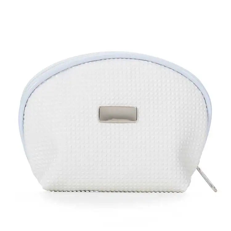 Necessaire em material sintético texturizado com uma placa central para personalização. Parte interna revestida com cetim.