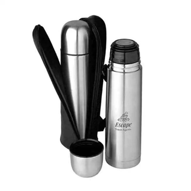 Garrafa térmica 500ml em inox com tampa rosqueável, tampa interna em plástico resistente(basta um clique para abrir ou fechar). Acompanha capa protetora de material sintético com alça de nylon.