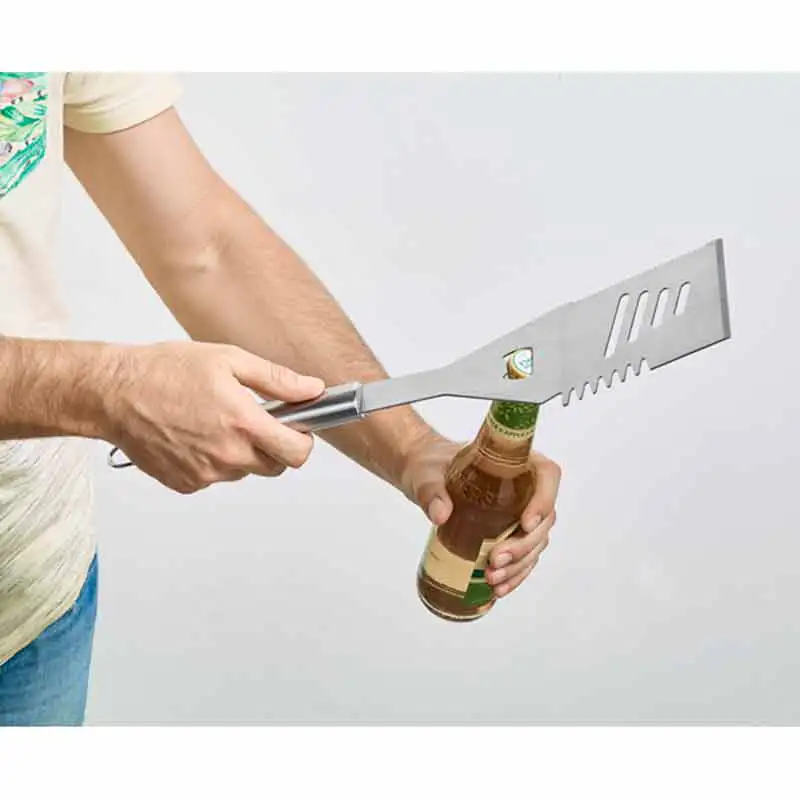 Kit churrasco. Aço inox. Luva de cozinha em poliéster e 6 peças em estojo de alumínio. Food grade. Estojo: 450 x 170 x 80 mm | Placa: 80 x 50 mm