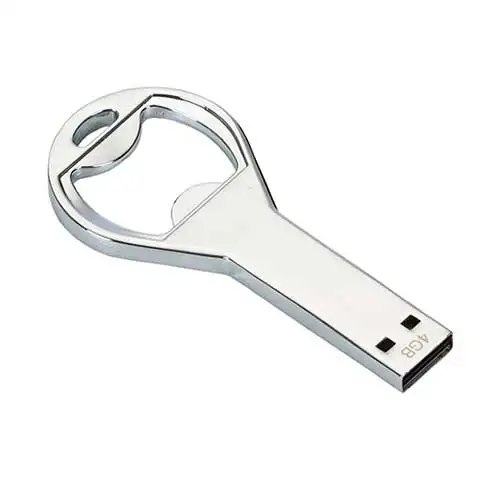 Pen drive de metal 4GB com abridor, parte superior possui um “furo” que pode ser utilizado para colocar algum cordão.