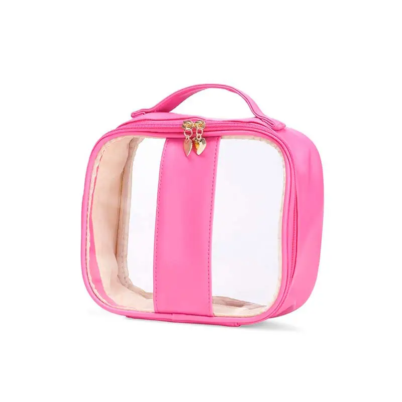 Necessaire impermeável de PVC e PU tamanho P, parte interna com revestimento em tecido, possui alça superior para as mãos, e detalhe dourado em formato de coração no zíper.