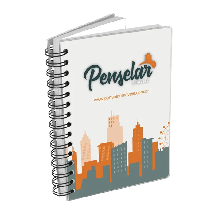 Caderno com 98 folhas pautadas em papel offset 63g mais uma folha com dados pessoais.Capa impressa no papel em offset em 4 cores e encapsulada em plástico rígido transparente, encadernada com Wire-o. Arte exclusiva do cliente.Medidas: 20,5 x 15 cm