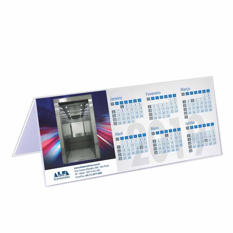 Calendário de Mesa Personalizado, impresso no papel em offset e encapsulado em plástico rígido transparente. Tecnologia exclusiva e fabricação. Medidas: 19 x 7,5 x 7,5 cm