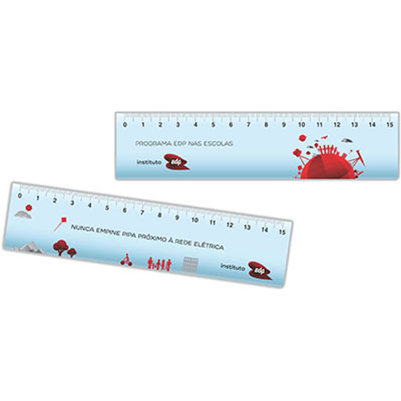 Régua de 15 cm personalizada impressa no papel em off-set e encapsulada em plástico rígido transparente.Desenho exclusivo, criação do cliente. Processo exclusivo Hukyplast.