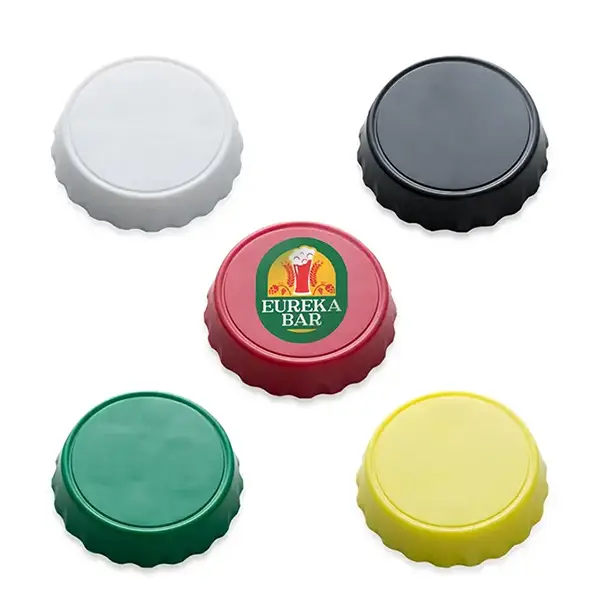 Abridor de garrafa Personalizado em formato de tampa, feito de plástico resistente com ímã de geladeira.