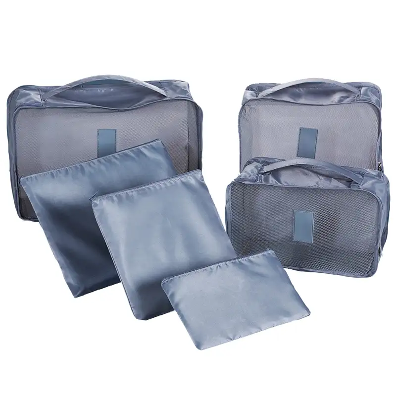 Kit necessaire viagem com 6 peças confeccionadas em nylon fino. O cojunto de necessaires possui tamanhos diferenciados, sendo 3 unidades com: alça para transporte, zíperes, parte frontal com malha de nylon; possui também 3 unidades de necessaires em nylon inteiramente lisas