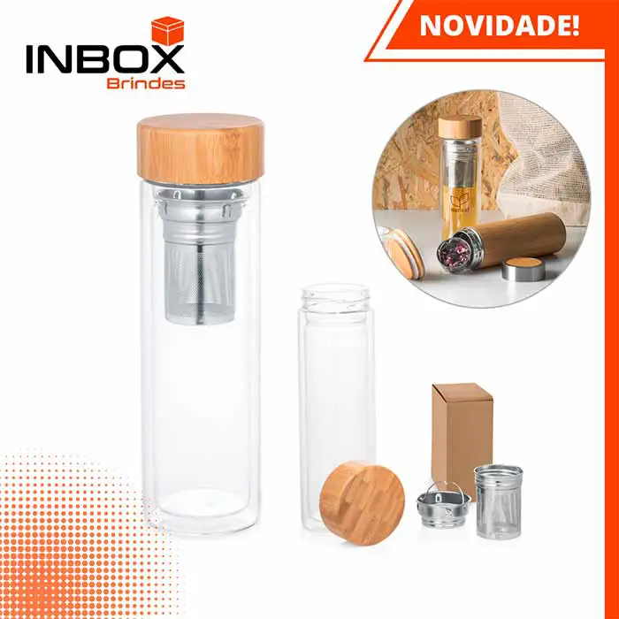 Garrafa em vidro de borossilicato com parede dupla e tampa em bambu. Incluso 2 infusores em aço inox. A garrafa tem uma capacidade até 490 ml. Apta para ir a máquina de lavar, removendo a tampa. Fornecida em caixa em papel kraft. ø72 x 234 mm