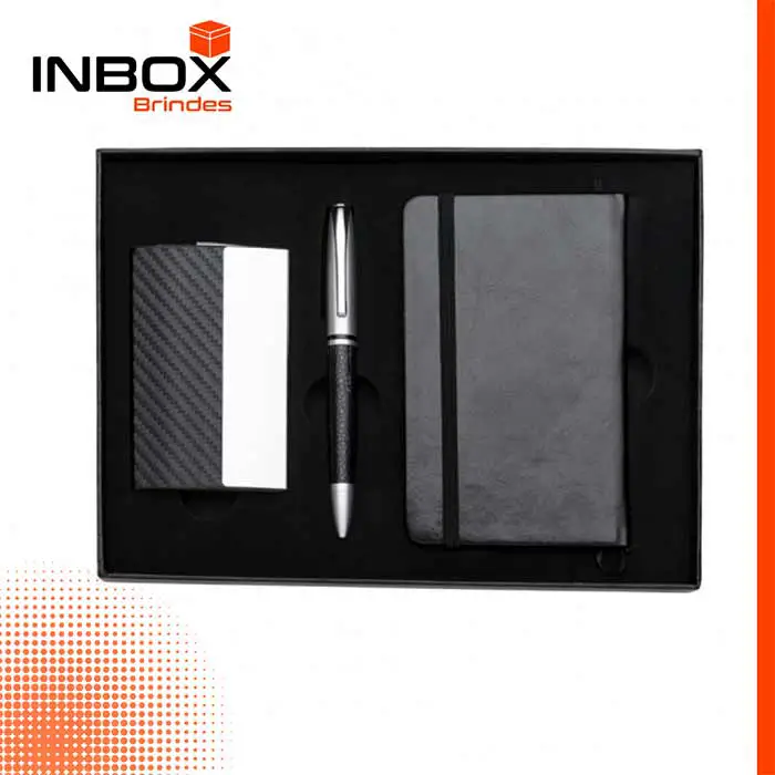 Kit executivo 3 peças em estojo de papelão com tampa e parte interna revestida de espuma. Contém: porta cartão de material sintético texturizado com detalhes prata brilhante, caneta metal fosca com detalhe emborrachado preto, caderneta em material sintético com aproximadamente 80 folhas amarelas pautadas.