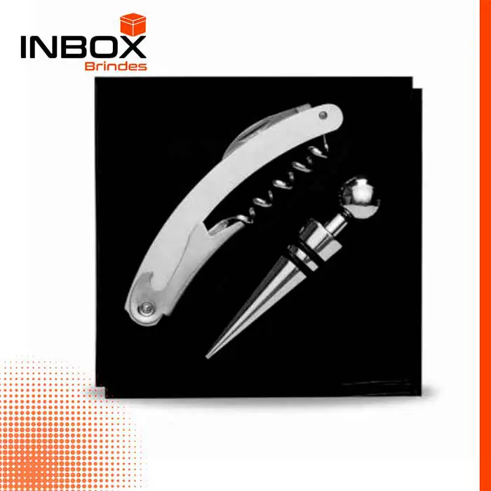Kit vinho 2 peças em caixa de papelão com tampa, revestimento interno de espuma. Possui saca rolhas de metal e tampa de bico