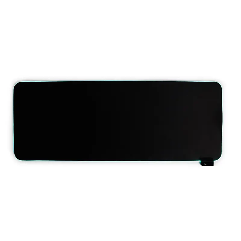 Desk pad flexível em microfibra com base antiderrapante em EVA. Apresenta bordas com cantos arredondados e faixa com iluminação LED colorida ajustável, alimentada via cabo USB. Acompanha cabo Micro-USB.