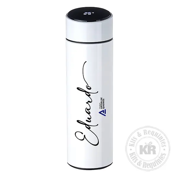 Garrafa térmica de parede dupla em inox personalizada, capacidade de 400ml. Tampa com display touch screen de temperatura em led, acompanha infusor de bebidas.