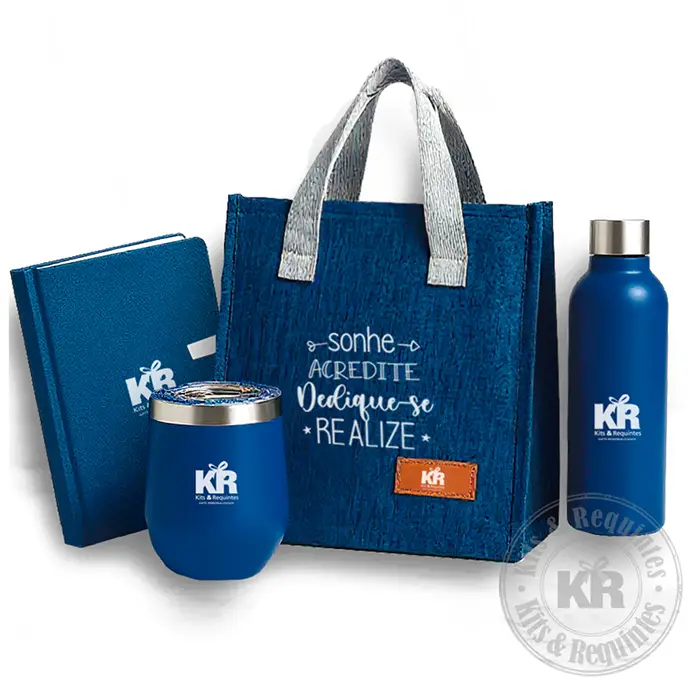 Kit composto por: Bolsa térmica, Garrafa de inox 800ml, Bloco de anotações com pauta e fecho e Copo térmico 320ml.