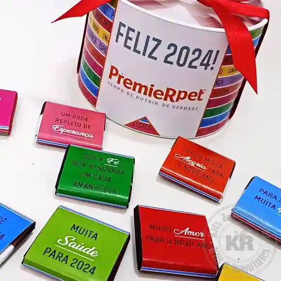 Lata de alumínio personalizada com 10 tabletinhos de chocolate Cacau Show personalizados. Embalada com fita de cetim