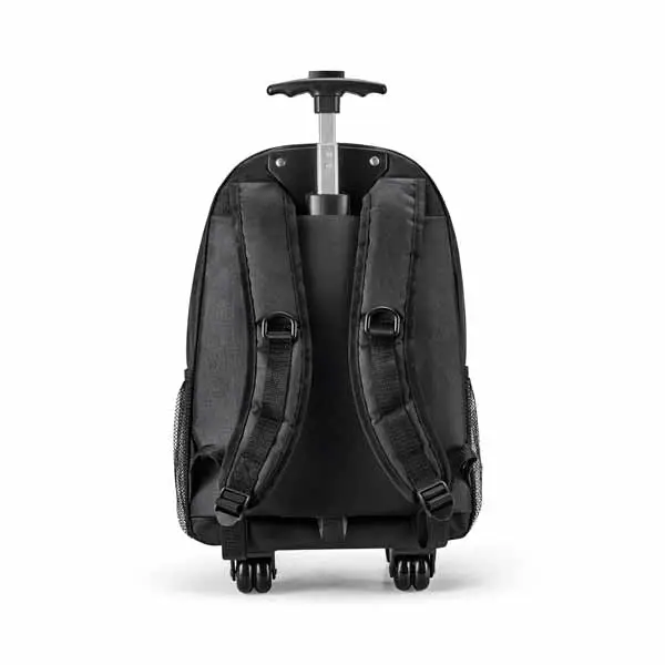 Mochila trolley para notebook. 300D. Com 2 rodas duplas. Compartimento principal forrado e almofadado, com divisória almofadada para notebook até 15.6''''''''''''''. Segundo compartimento forrado. 2 bolsos laterais com tela. Com protetor de rodas e alças almofadadas. Pega extensível em alumínio, com mola (altura da pega estendida: 550 mm). Capacidade até 17 L. Peso: 1,10 kg. 310 x 430 x 140 mm, 01 gravação