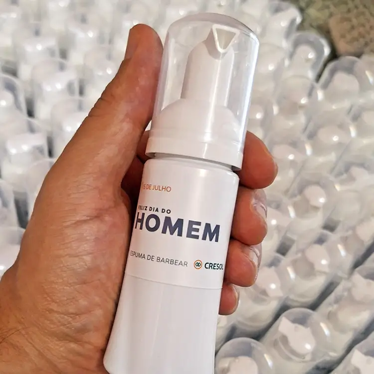Frasco de plástico branco, com Válvula espumadora branca e Rótulo em BOPP adesivo com impressão colorida de alta qualidade.
