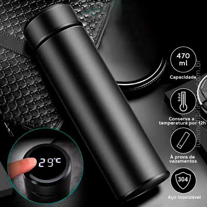 Garrafa Thermos Digital é uma garrafa térmica possui tampa de rosca com indicador LED de temperatura acoplado: para visualizar a temperatura interna do liquido! Com sistema de vedação anti vazamentos, formato cilíndrico e design elegante. Ideal para manter a sua bebida gelada por um tempo prolongado (até 12h) e em qualquer lugar: na academia, no trabalho, na trilha ou no parque! Leve na bolsa ou na mochila, sem preocupações.
