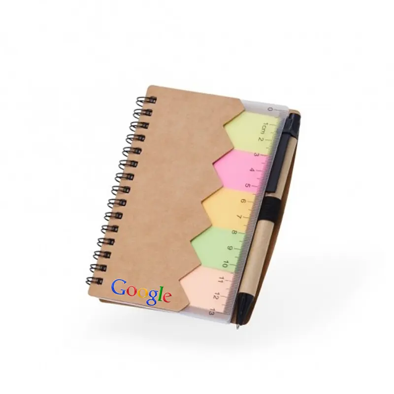 Bloco de anotações ecológico com autoadesivos, régua e caneta, feito em kraft. Contém folha com régua 13 cm, cinco autoadesivos com aproximadamente 13 folhas, bloco com aproximadamente 69 folhas brancas com pauta, porta caneta elástico e acompanha caneta de papelão com detalhes plásticos, carga esferográfica azul 1.0mm e acionamento por clique.