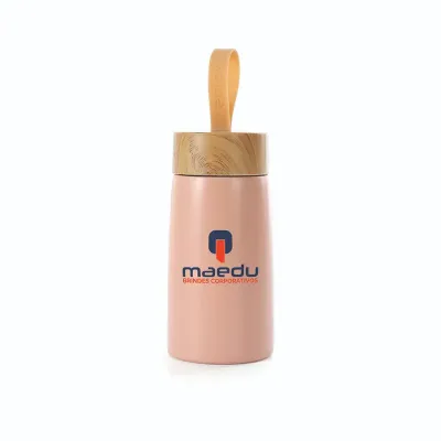 Garrafa inox 304 com parede dupla, capacidade de 250ml. Contém tampa plástica com design de bambu e alça de silicone para transporte.