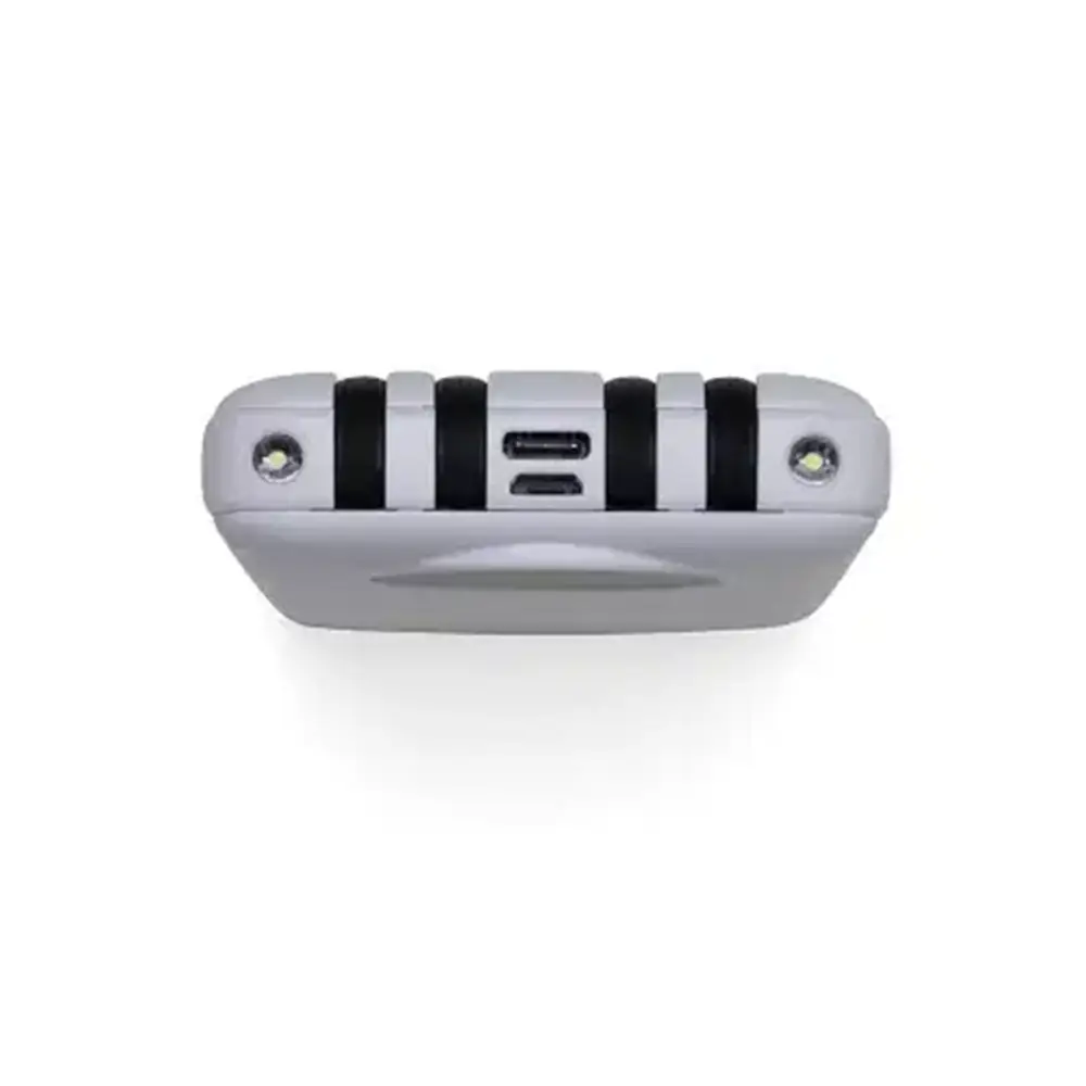 Carregador portátil de 10.000mAh com display digital indicador de bateria, contém duas lanternas de led e quatro cabos de saída acoplados, sendo: saída Lightning, saída Tipo-C, saída V8 e saída USB. O carregador possui uma porta USB dupla (entrada e saída) com carga rápida e outras duas portas de entrada: V8 e Tipo-C. Acompanha cabo USB.