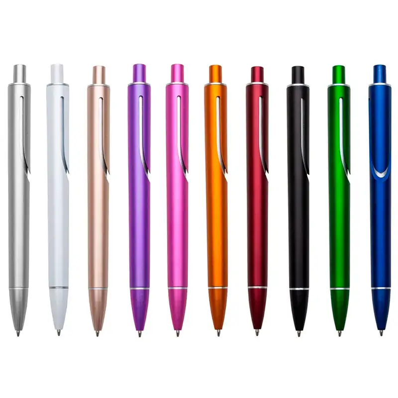 Descrição: Caneta plástica com carga esferográfica azul e acionamento por clique.