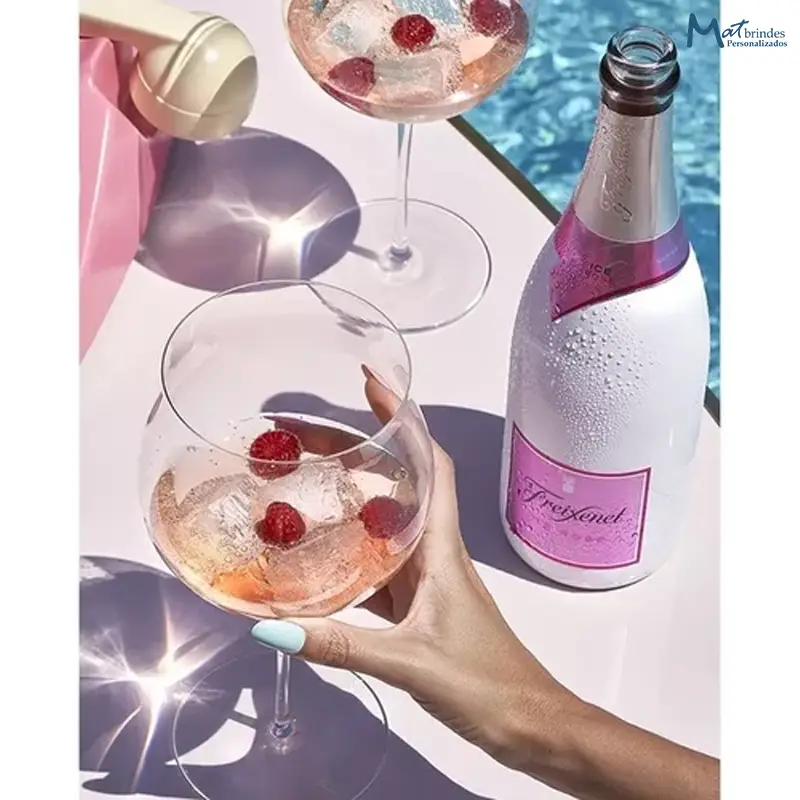 Com seu intenso aroma de frutas vermelhas como framboesas e morangos, Freixenet Ice Rosé é uma ótima pedida para os dias mais quentes, podendo ser apreciado apenas com gelo ou combinado com frutas, pois harmoniza perfeitamente com coquetelaria em diversas versões. As taças Barone, de design sofisticado, complementam o kit, oferecendo uma experiência de brinde completa e inesquecível. Aposte em drinks refrescantes, diferenciados e deslumbre seus clientes e colaboradores.
