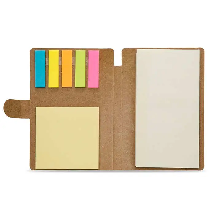 Bloco de anotações ecológico, material kraft. Possui uma trava na própria capa, cinco blocos autocolantes coloridos com aproximadamente 25 folhinhas, bloco autocolante amarelo com aproximadamente 25 folhas e bloco grande com aproximadamente 70 folhas. Dimensões: 15,3 x 10,3 cm