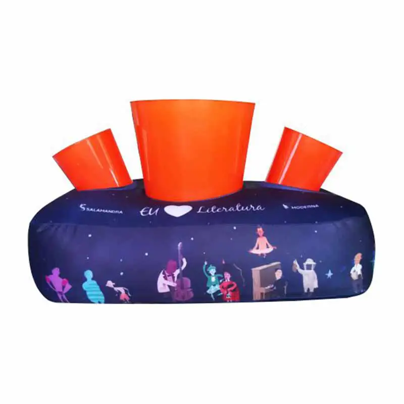 Produzido em: Tecido 100% Polyester, Impressão em Silk Screen ou sublimação, com enchimento de Fibra Siliconada, Acompanha Copos de Refrigerante e Baldes de Pipocas.