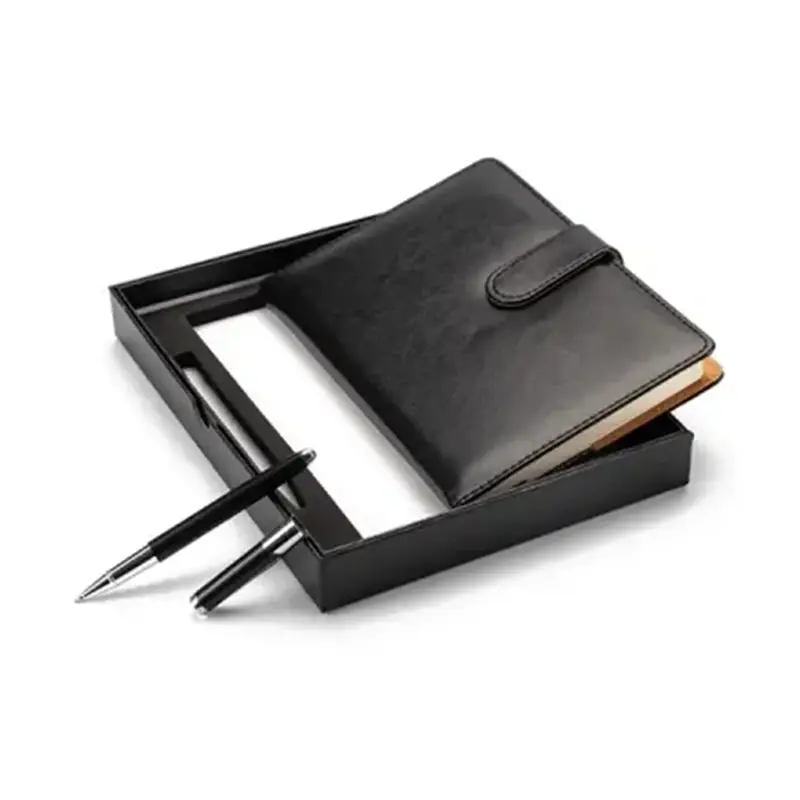 O kit é composto por uma caneta metálica esferográfica 1.0mm na cor preta e uma caderneta em couro sintético com fechamento imantado. A caderneta possui aproximadamente 96 folhas pautadas na cor marfim com fita de cetim para marcar, e um suporte para a caneta, em um estojo de papelão, acompanhado de uma plaquinha .