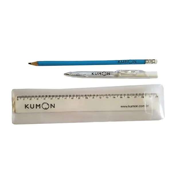 Kit contendo lápis com borracha no topo, régua de 20 cm, caneta esferográfica com click, em embalagem estojo de PVC cristal com aba ou fecho zip zap.