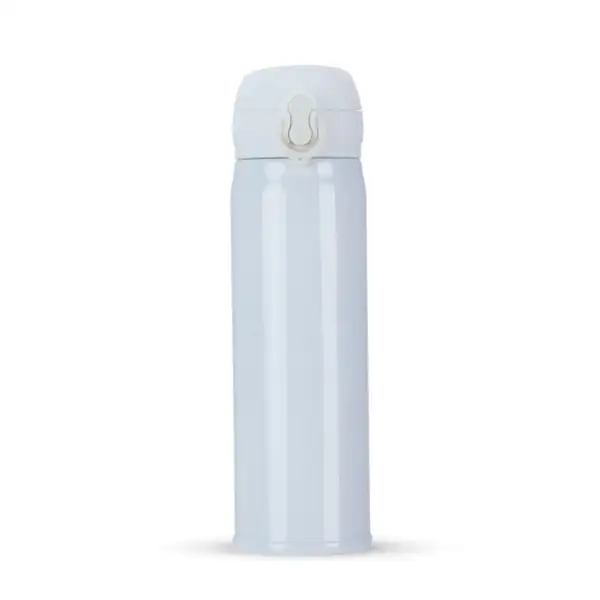 Garrafa térmica de 400ml de metal colorida com botão e válvula para abertura. Possui um sistema de trava (basta mover para cima/baixo para abrir/fechar), pressione o botão central para abrir a tampa(possui na parte interna borracha protetora evitando vazar o líquido). Para abrir a tampa por completo basta rosqueá-la, parte interna revestida em inox.