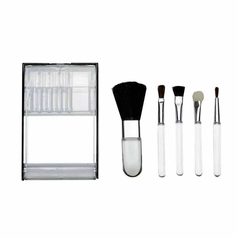 Kit pincel 5 peças em estojo plástico com visor transparente. Parte interna acompanha um espelho, compartimento dos pincéis é inclinável. Possui: pincel para blush, pincel para corretivo, pincel para sombra, pincel para lábios e pincel para sobrancelha.